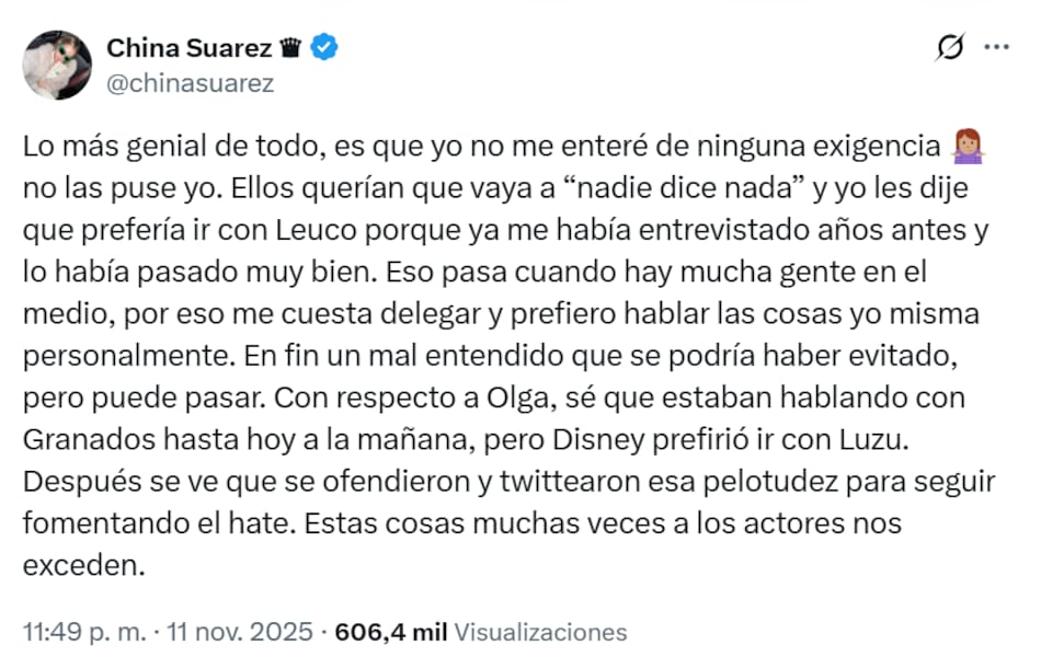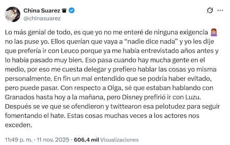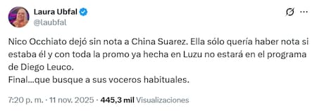 Tras la polémica cancelación de la entrevista de la actriz en Antes que Nadie, Laura Ubfal publicó un tuit informando la situación y tirándole un palito a la China: “Nico Occhiato dejó sin nota a China Suárez. Ella sólo quería hacer nota si estaba él y con toda la promo ya hecha en Luzu, no estará en el programa de Diego Leuco. Final... que busque a sus voceros habituales”.