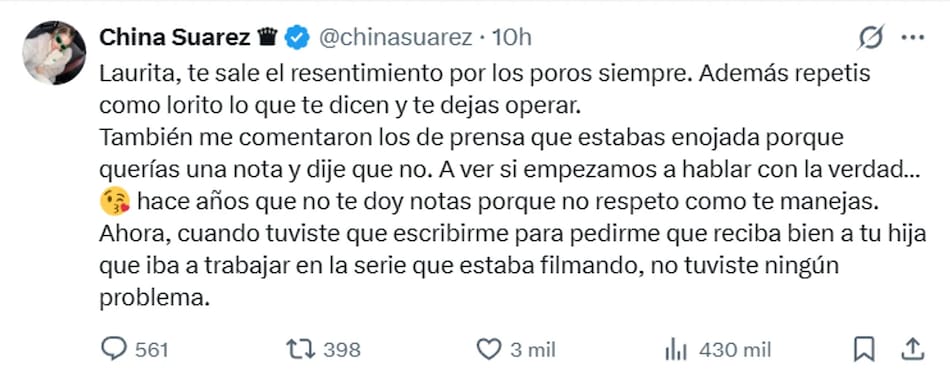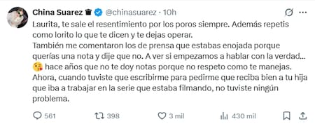 La China tomó el guante y le contestó el tuit, exponiendo que la periodista también buscó una nota con ella, pero que no decidió dársela: “Laurita, te sale el resentimiento por los poros siempre. Además, repetís como lorito lo que te dicen y te dejas operar. También me comentaron los de prensa que estabas enojada porque querías una nota y dije que no. A ver si empezamos a hablar con la verdad…”.