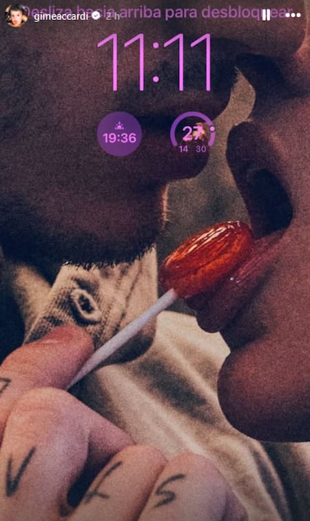 Las publicaciones subidas de tono no quedaron ahí. Gime Accardi también compartió la imagen que eligió como fondo de pantalla de su celular: una foto de ella con un chupetín rojo en la boca, muy cerca de la boca de Kayne. En la captura, además, se aprecia la hora 11:11 y algunas notificaciones vinculadas a su salud.