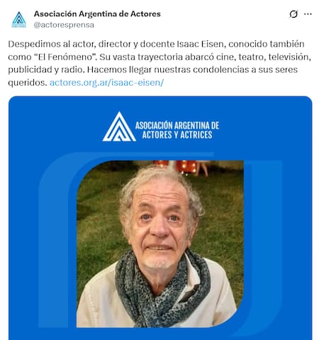 “Despedimos al actor, director y docente Isaac Eisen, conocido también como ‘El fenómeno’. Su vasta trayectoria abarcó cine, teatro, televisión, publicidad y radio”, publicaron en un comunicado.