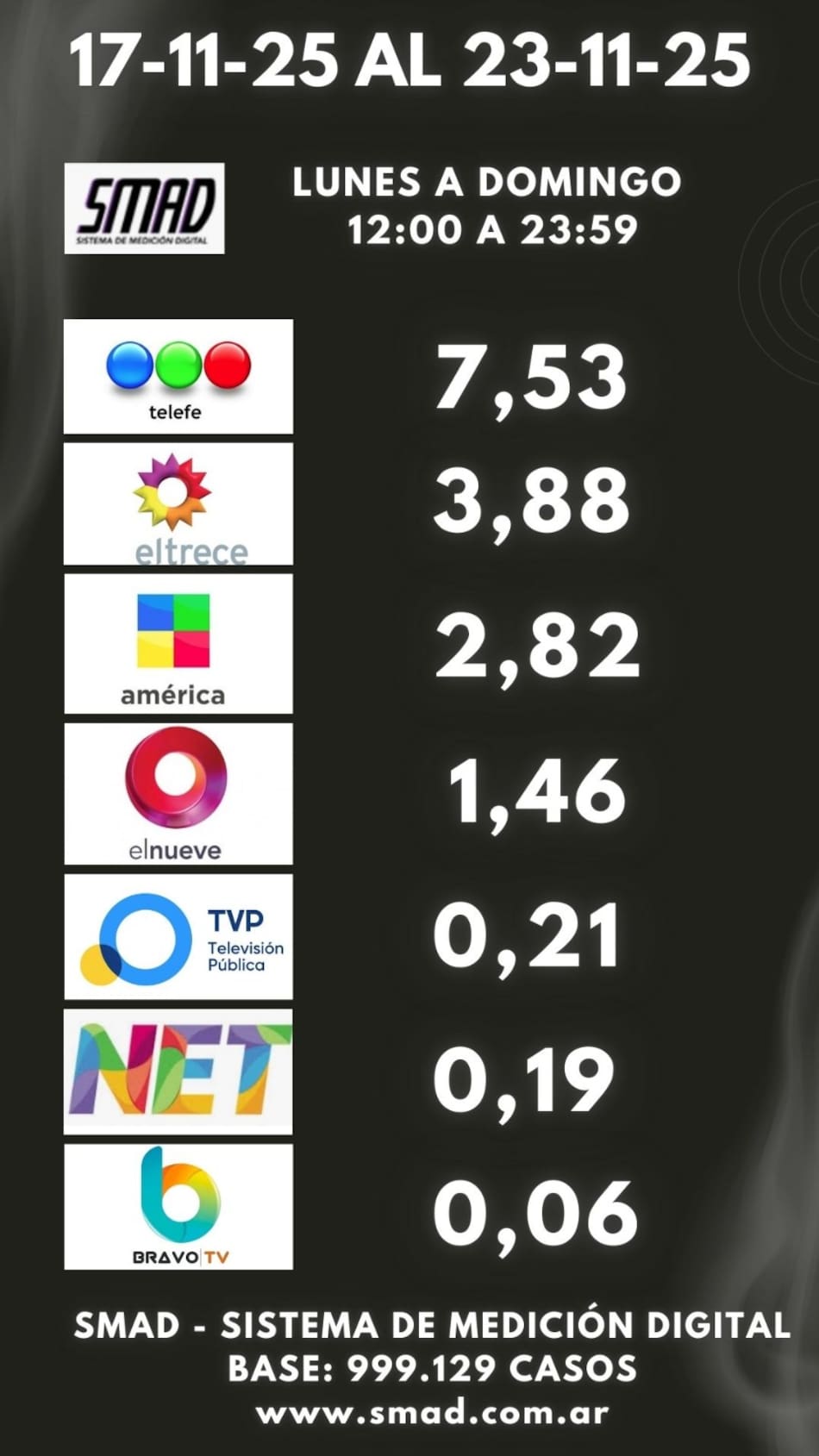 Telefé se impuso de apertura a cierre, entre las 12:00 y las 23:59 con un promedio de 7,53 puntos de rating, según datos de la medidora de audiencia SMAD (Sistema de Medición Digital). Con una base de 998.026 casos, el “canal de las pelotas” sostuvo su liderazgo por sobre El Trece, que se ubicó en el segundo puesto con 3,88.