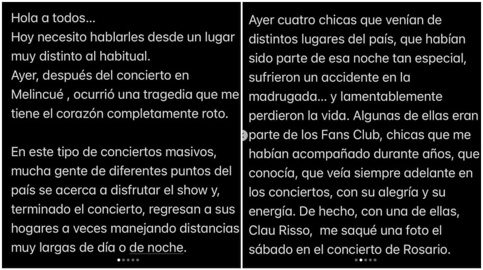 A través de una carta abierta en sus redes, el cantante hizo un extenso posteo: “Hola a todos... Hoy necesito hablarles desde un lugar muy distinto al habitual. Ayer, después del concierto en Melincué (Santa Fe), ocurrió una tragedia que me tiene el corazón completamente roto”.
