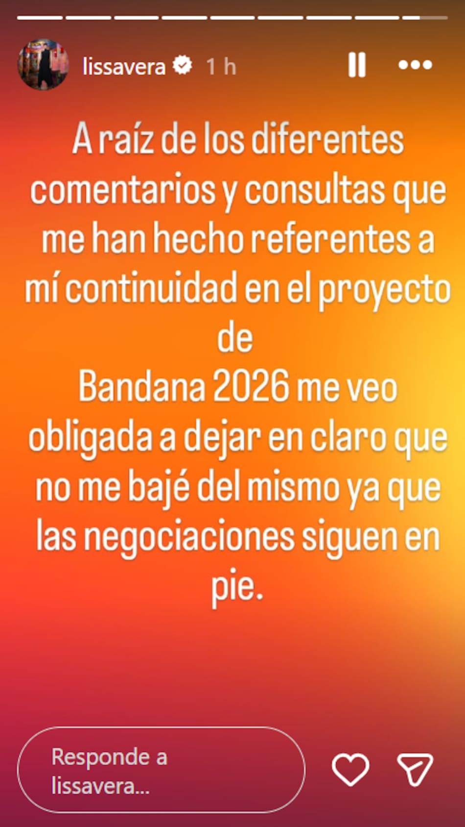 Tras los intensos rumores de su salida de las Bandana, Lissa Vera rompió el silencio a través de historias de Instagram. Luego de que sus compañeras del grupo dieran a entender que no estaba muy claro si seguiría siendo parte de las Bandana en 2026, la cantante aclaró las versiones.