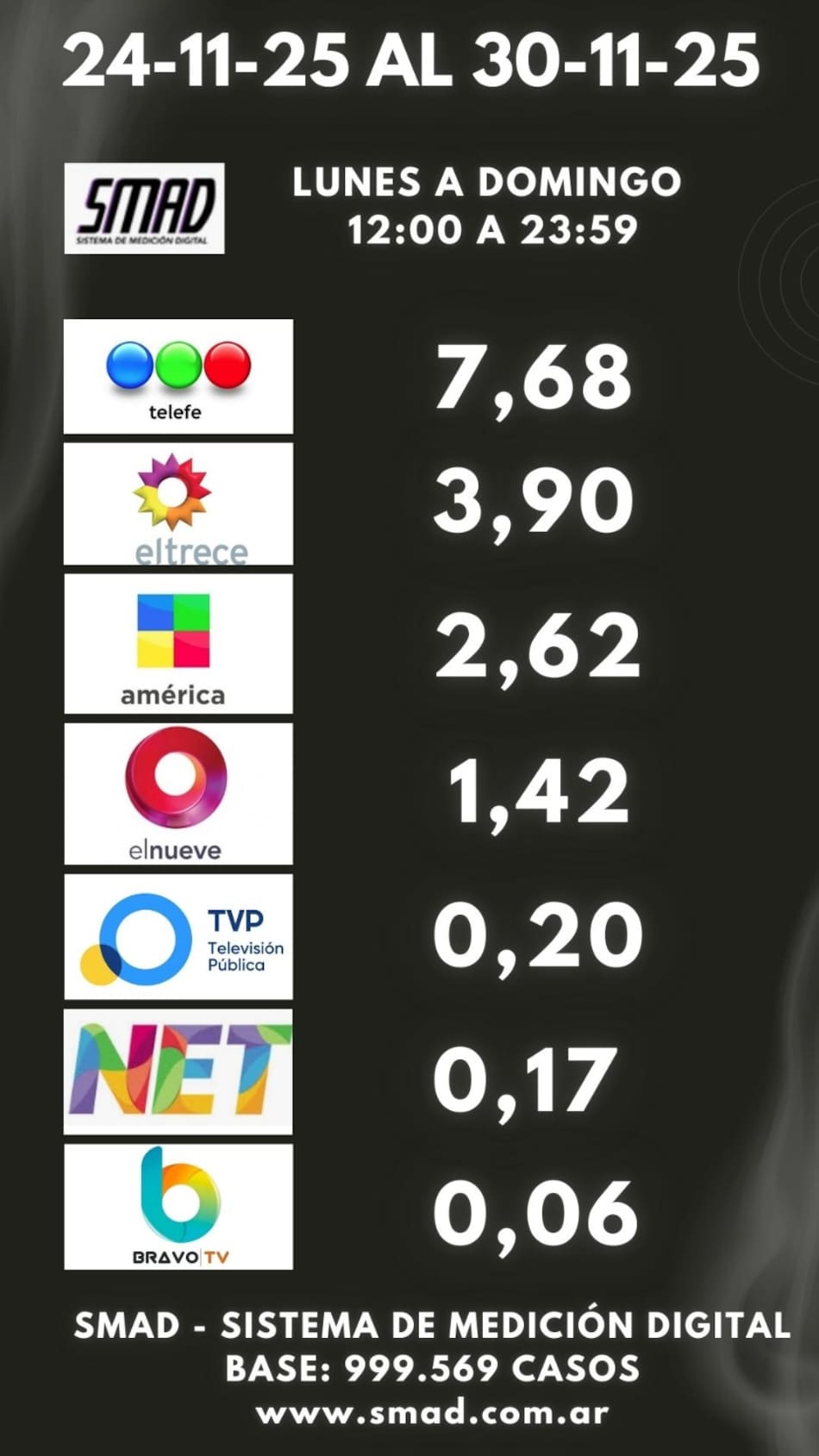 Durante la última semana de noviembre, se impuso nuevamente ante toda su competencia, según la medición de SMAD (Sistema de Medición Digital).