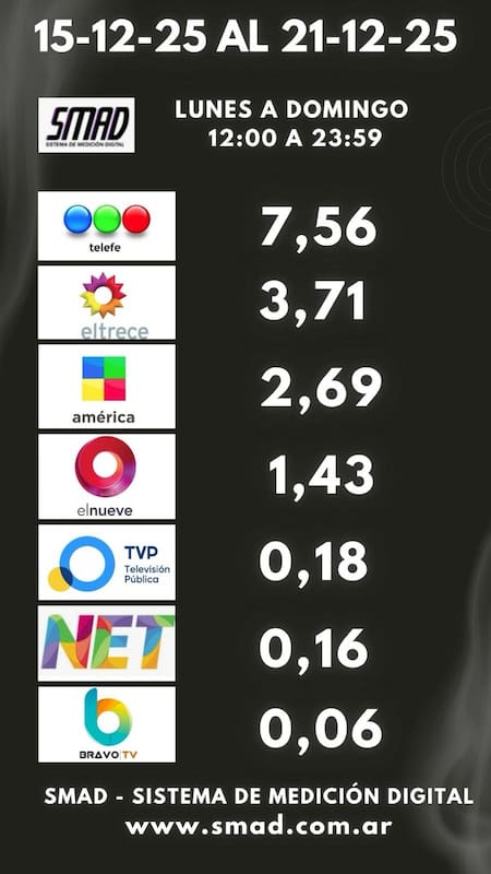Telefe cerró la tercera semana de diciembre de 2025 con un promedio de 7,56 ppuntos, dejando a El Trece en el segundo puesto, con 3,71.