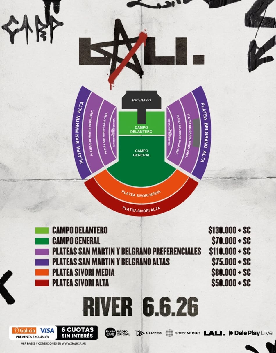 En cuanto a los precios, el flyer promocional aclara cuáles son los sectores y sus respectivos precios. Las entradas van desde los $50.000 hasta los $130.000, sin contar los costos de servicio.