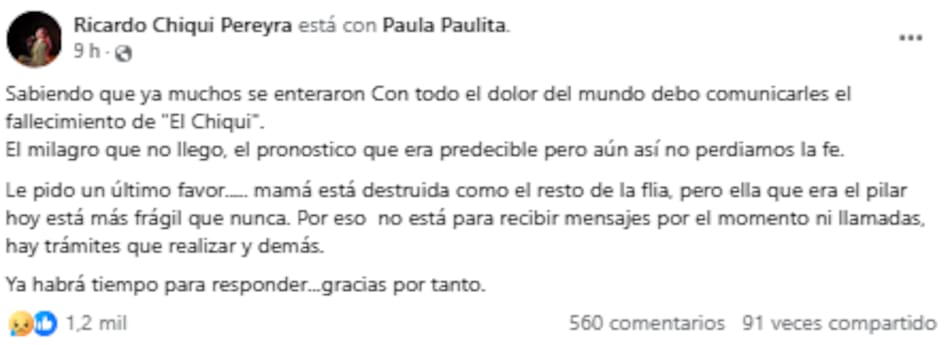 La confirmación del fallecimiento fue comunicada por su entorno más cercano a través de un mensaje difundido en redes sociales, en el que expresaron: “Con todo el dolor del mundo debo comunicarles el fallecimiento de ‘El Chiqui’. El milagro que no llegó, el pronóstico que era predecible pero aún así no perdíamos la fe”.