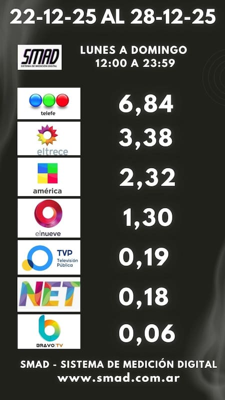 En la semana comprendida entre el lunes 22 y el domingo 28 de diciembre, se impuso otra vez ante toda su competencia, según la medición de SMAD (Sistema de Medición Digital).