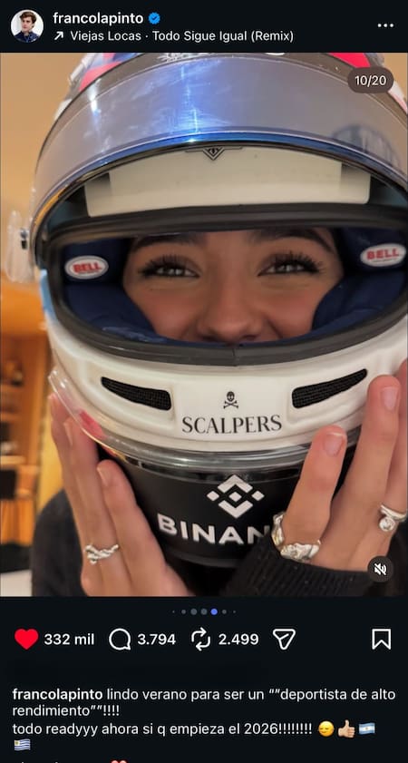 En la imagen número diez del carrusel, aparece una joven usando uno de los cascos que suele utilizar el piloto pilarense. La fotografía no muestra su rostro completo: apenas se distinguen sus ojos, un detalle que fue suficiente para disparar todo tipo de conjeturas entre los usuarios.