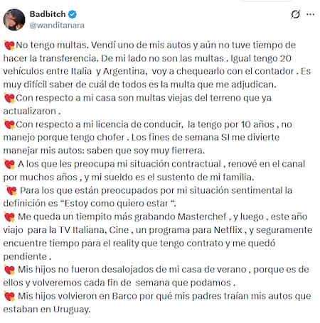 En un descargo que publicó en su cuenta de X, la mediática aclaró uno por uno los rumores que la persiguen desde su llegada a Buenos Aires: desde su relación amorosa actual hasta unas supuestas multas por no pagar la patente de sus autos.