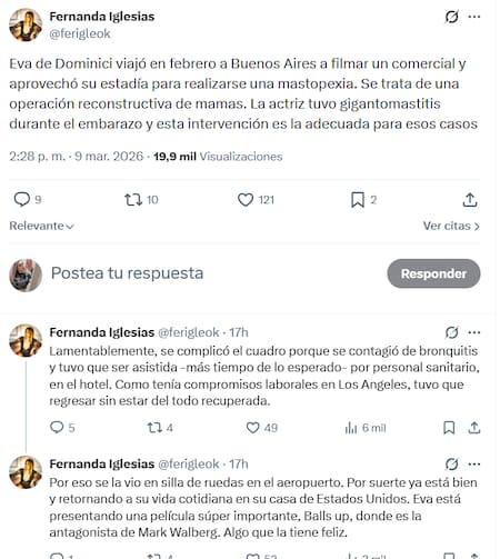 Sin embargo, la recuperación no habría sido sencilla. La periodista explicó que el cuadro se complicó luego de que De Dominici se contagiara bronquitis, lo que obligó a que recibiera asistencia médica durante más tiempo del previsto en el hotel donde se alojaba.