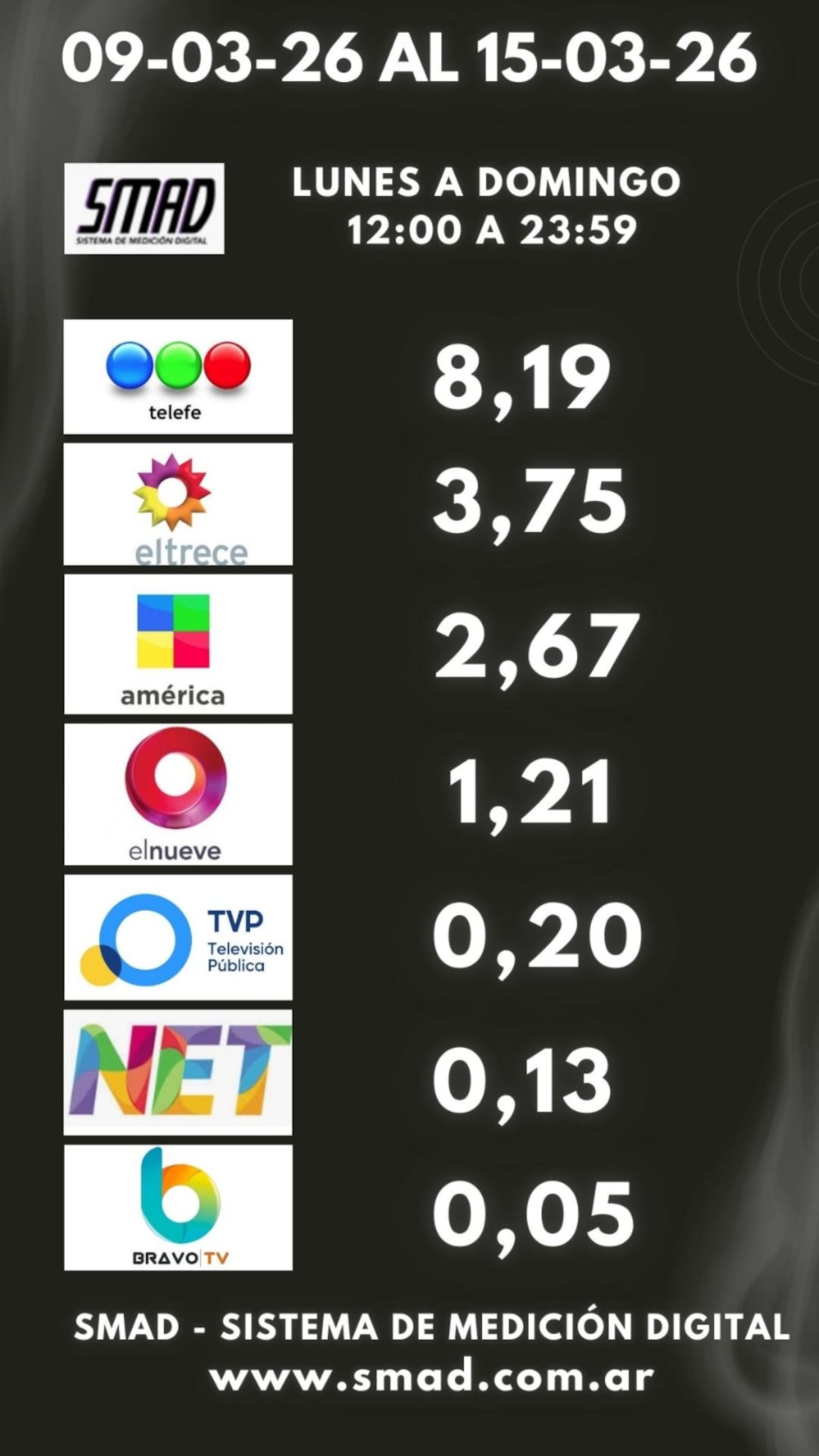 Telefe sostuvo su liderazgo por sobre El Trece, que se ubicó en el segundo puesto con 3,75. El tercer lugar fue para América con 2,67 y le siguieron Canal 9 (1,21), TV Pública (0,20), NET TV (0,13) y Bravo (0,05).