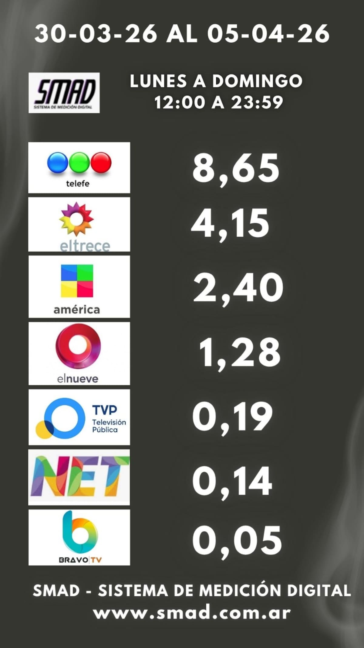 El canal de las pelotas se impuso durante la última semana, entre el lunes 30 de marzo y el domingo 05 de abril de 2026, según la medición de SMAD (Sistema de Medición de Audiencia Digital).