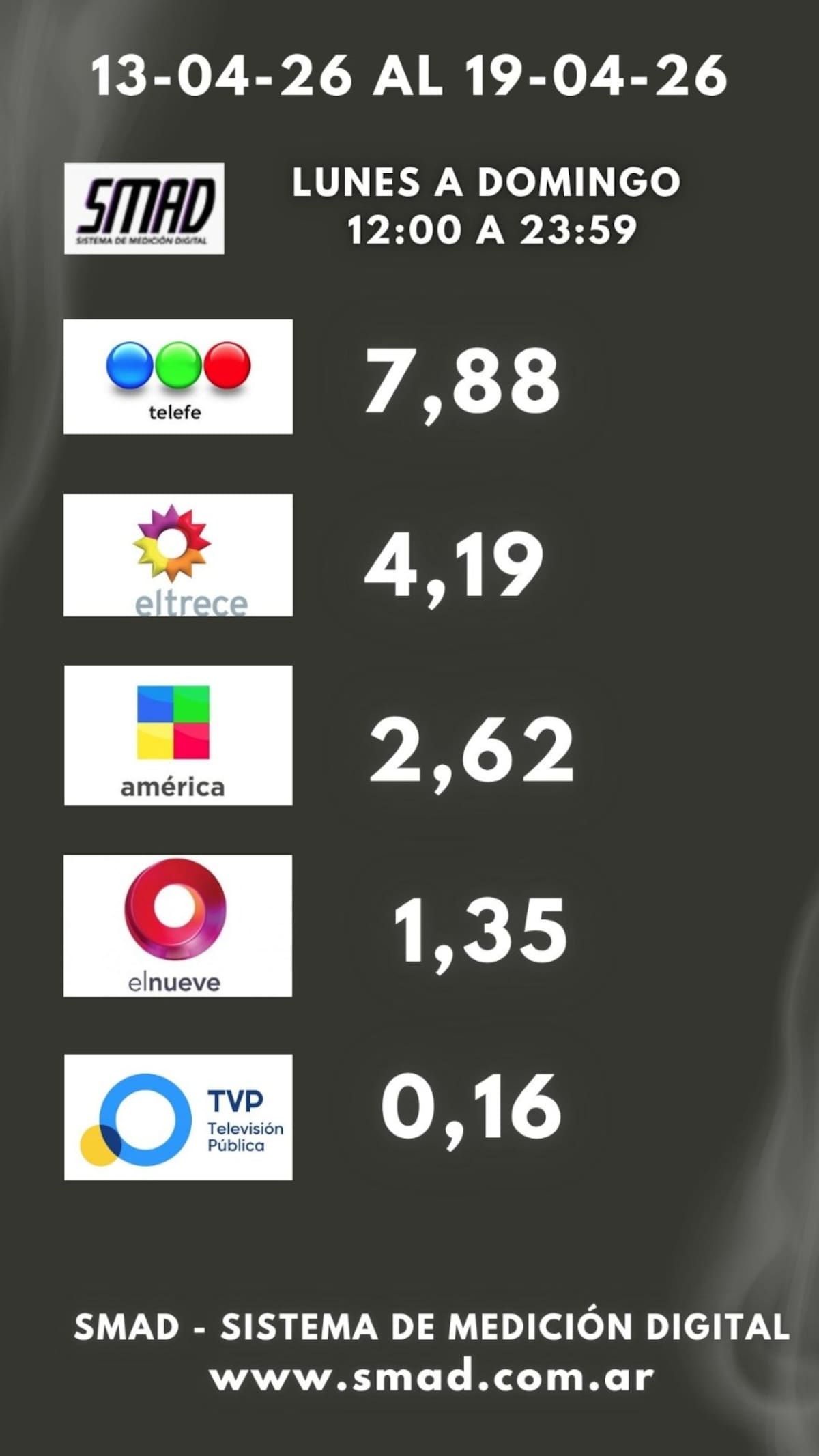 Telefe se impuso durante la última semana, entre el lunes 12 y el domingo 19 de abril de 2026, según la medición de SMAD (Sistema de Medición de Audiencia Digital).