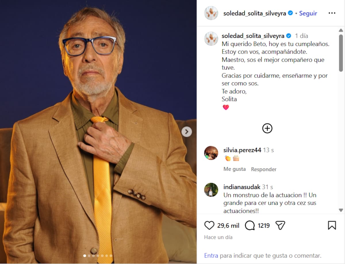 El actor argentino partió un día después de su cumpleaños. En un mensaje vía Instagram, Solita lo había saludado: “Mi querido Beto, hoy es tu cumpleaños. Estoy con vos, acompañándote”. Y agregó: “Maestro, sos el mejor compañero que tuve. Gracias por cuidarme, enseñarme y por ser como sos. Te adoro, Solita”.