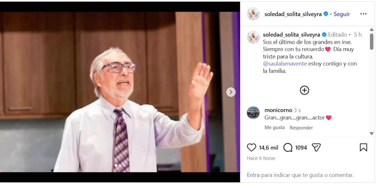 “Sos el último de los grandes en irse. Siempre con tu recuerdo”, comentó vía Instagram en un posteo con fotos y un video del actor argentino. Supieron ser grandes amigos durante muchos años y han compartido pantalla y escenario en más de una ocasión.