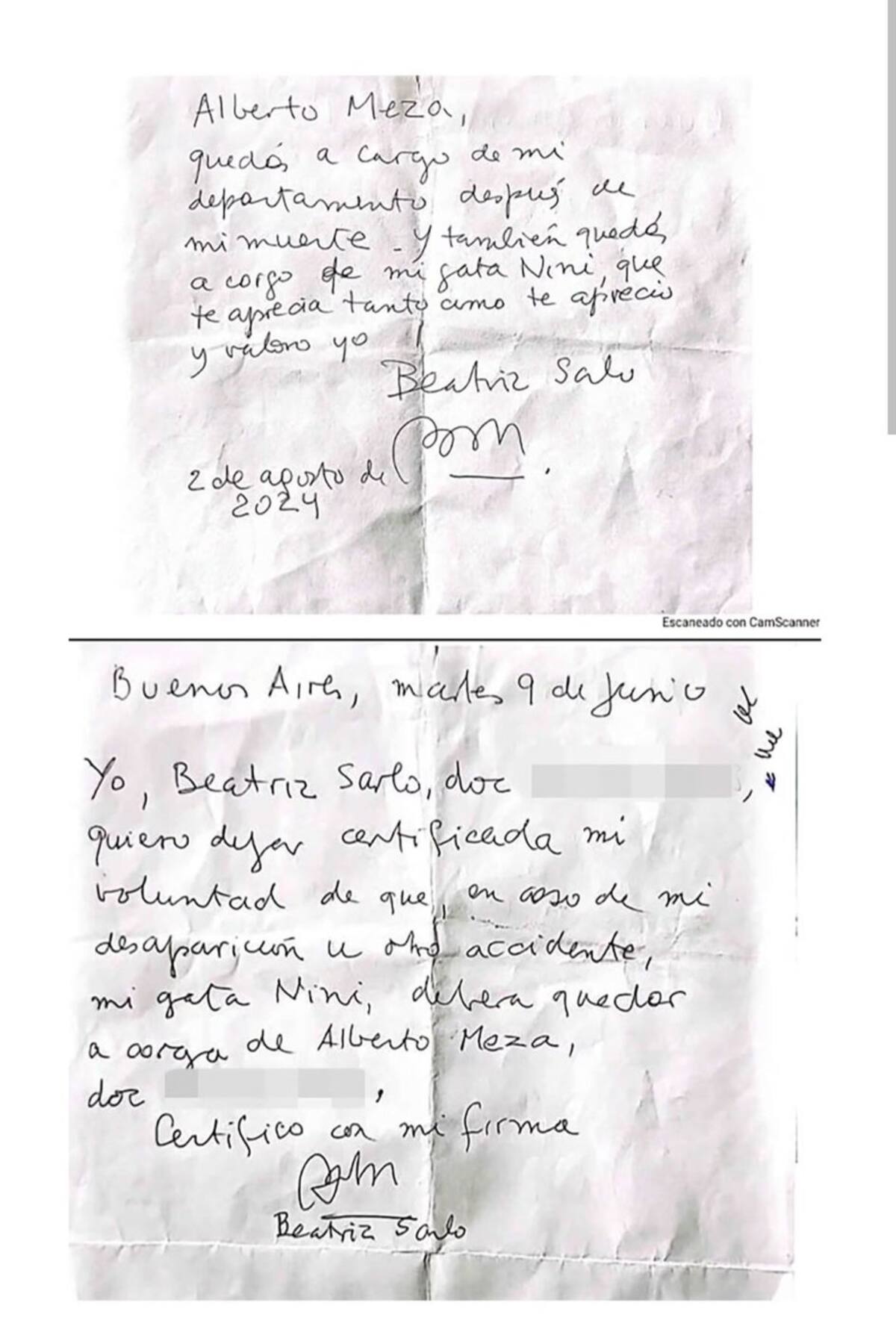 Un segundo manuscrito, que data del 2 de agosto, detalla: “Alberto Meza quedás a cargo de mi departamento después de mi muerte y también quedás a cargo de mi gata Niní, que te aprecia tanto como te aprecio y valoro yo”.