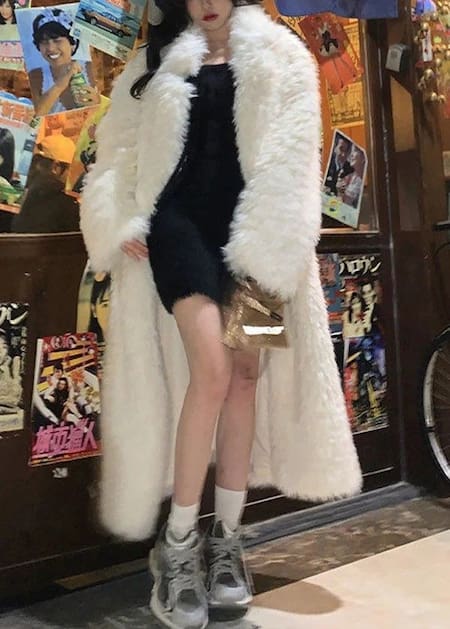 Una fórmula relajada pero efectiva para los días más fríos. El tapado tipo flurry (peluche sintético) en tonos neutros ofrece abrigo sin saturar el look. Se complementa con joggers y zapatillas blancas o nude.