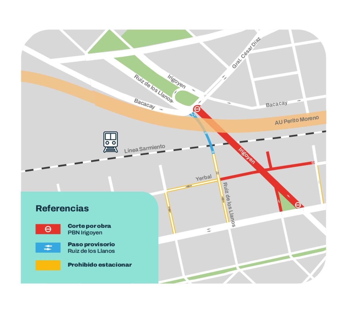 Durante el desarrollo de las obras, el tránsito sufrirá algunas modificaciones. Los vehículos que circulen por la avenida Rivadavia o por la calle Escalada, en dirección norte, deberán tomar Ruíz de los Llanos, cruzar las vías y luego girar a la derecha en César Díaz para volver a conectar con Irigoyen y continuar hacia Juan B. Justo.