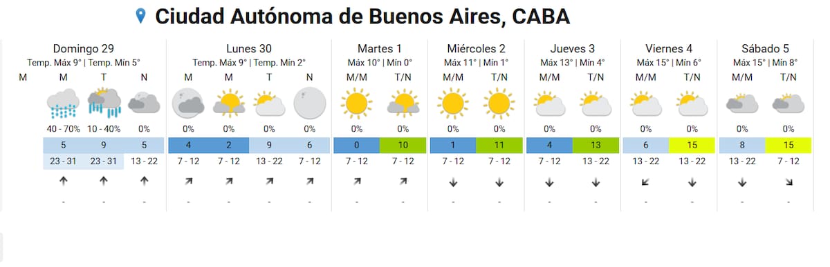 Además, según indicó el Servicio Meteorológico Nacional (SMN), el próximo martes sería el día más frío del año, con un cielo despejado, pero con temperaturas de 0 °C en la capital y valores negativos en el Conurbano. Esto augura nuevas heladas matinales en varias zonas.