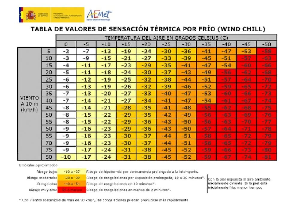 En realidad podemos aguantar de forma instantánea cualquier temperatura que alcance el aire, pero depende del tiempo de exposición. En color amarillo, naranja y rojo podemos ver el tiempo que resistimos dentro de cada uno de esos valores. En amarillo, hay riesgo de congelarse entre 10 a 30 minutos. En naranja, en 10 minutos. El más extremo, el rojo, indica que el riesgo es de menos de 2 minutos. Este es el límite que el ser humano puede aguantar a bajas temperaturas.