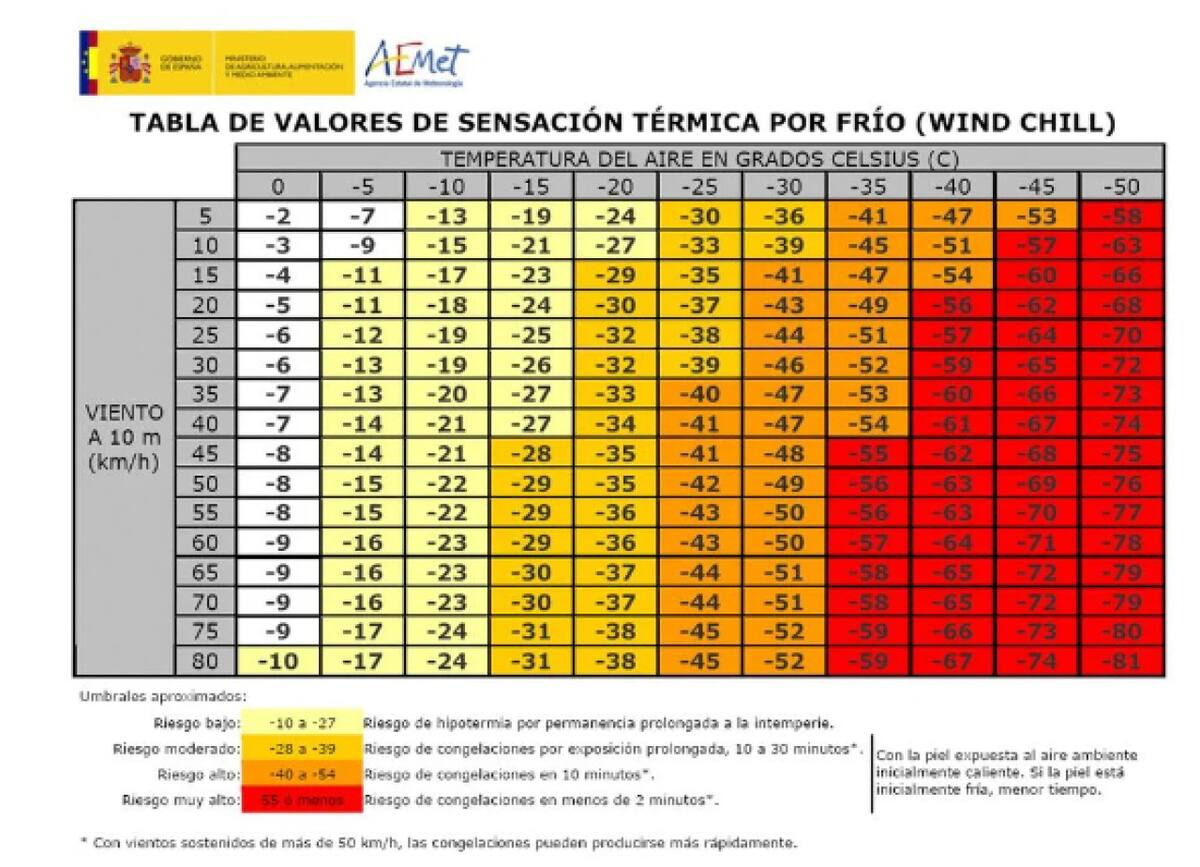 En realidad podemos aguantar de forma instantánea cualquier temperatura que alcance el aire, pero depende del tiempo de exposición. En color amarillo, naranja y rojo podemos ver el tiempo que resistimos dentro de cada uno de esos valores. En amarillo, hay riesgo de congelarse entre 10 a 30 minutos. En naranja, en 10 minutos. El más extremo, el rojo, indica que el riesgo es de menos de 2 minutos. Este es el límite que el ser humano puede aguantar a bajas temperaturas.