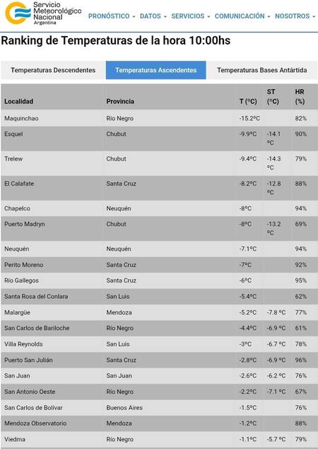 - Maquinchao (Río Negro): -15,2°C | Humedad: 82%.