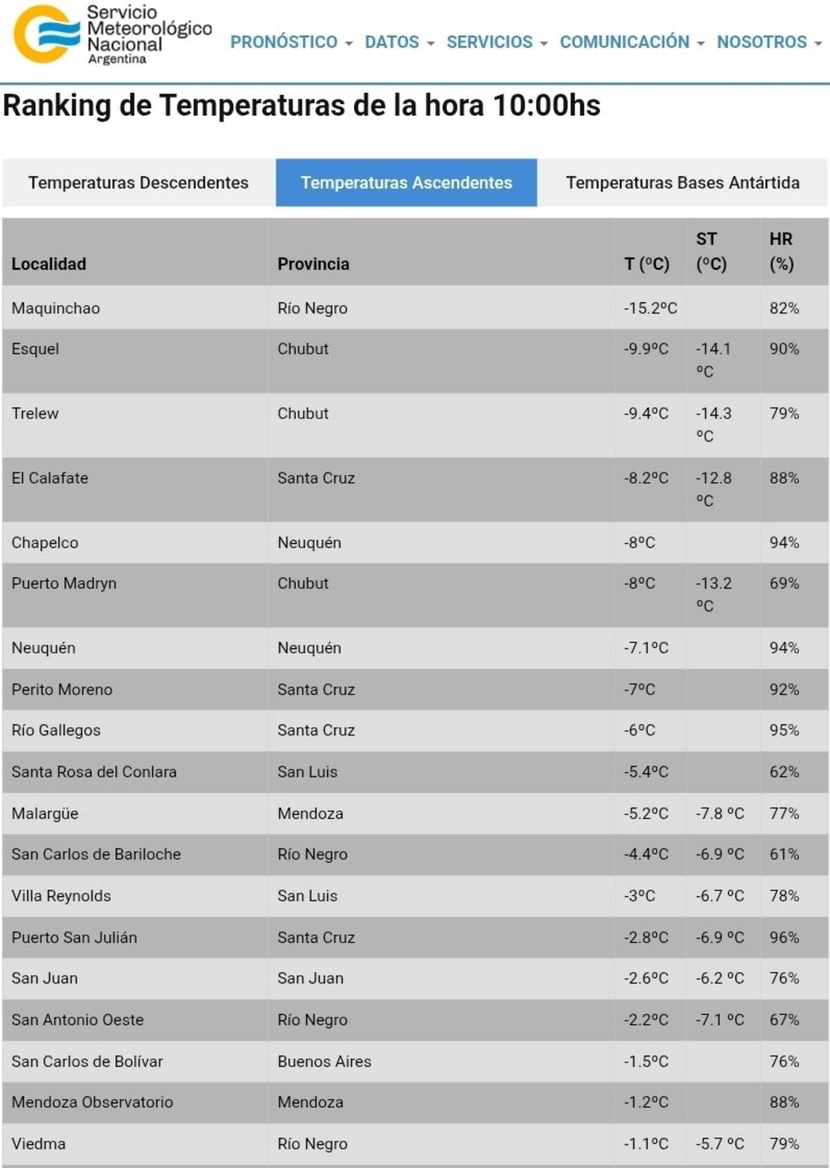 - Maquinchao (Río Negro): -15,2°C | Humedad: 82%.