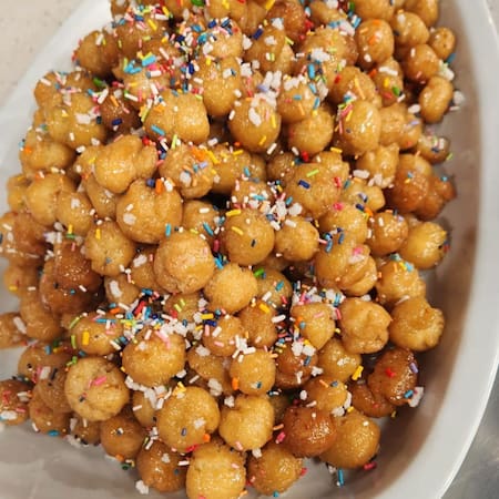 - Colocar la pignolata en una fuente y decorar con confites de colores. Es clave que se deje enfriar antes de servir.