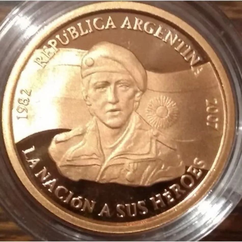 En el anverso, la moneda muestra la imagen de un excombatiente de la Gesta de Malvinas sobre la Bandera Argentina. En la parte superior figura la leyenda “1982 República Argentina 2007”, mientras que en la inferior puede leerse “La Nación a sus héroes”.
