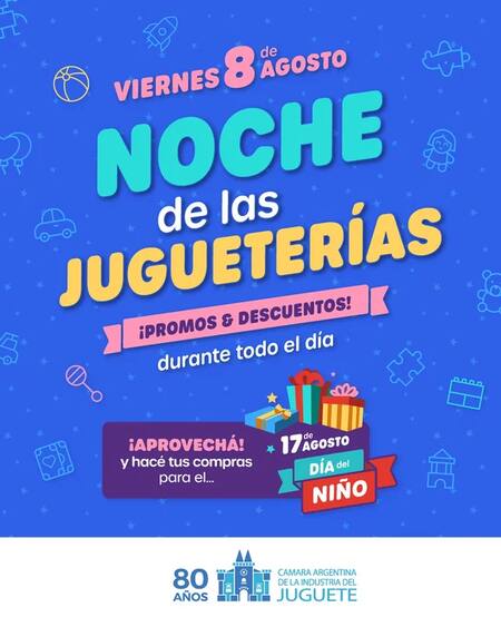 La Cámara Argentina de la Industria del Juguete (CAIJ) llevará a cabo una nueva edición de la “Noche de las Jugueterías”, un evento especial donde se ofrecerán importantes descuentos y promociones para incentivar las compras previas al Día del Niño, que este año se celebrará el domingo 17 de agosto.