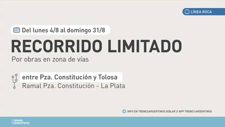 Desde este lunes 4 y hasta el 31 de agosto, los trenes de la Línea Roca no llegarán a la ciudad de La Plata debido a trabajos de renovación de vías. Así lo informó Trenes Argentinos, que detalló que durante este período las formaciones circularán con un recorrido limitado entre las estaciones de Plaza Constitución y Tolosa, que pasará a ser la terminal provisoria del servicio.