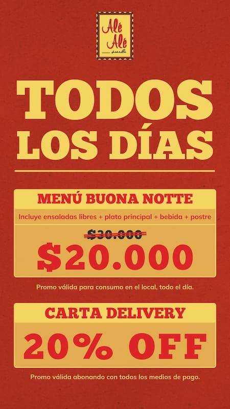 El restaurante Alé Alé ofrece varias promociones para los turistas y comensales, como por ejemplo, se puede acceder a una opción llamada “Buona Notte” que incluye ensaladas libres, plato principal, bebida y postre a solo $20.000 por persona, y está disponible durante todo el día.