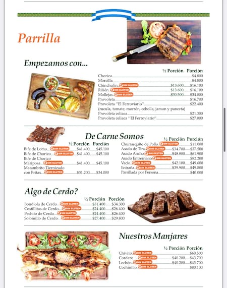 El Ferroviario ofrece una variedad de carnes y especialidades que se sirven con generosidad. Algunos de los precios más consultados: