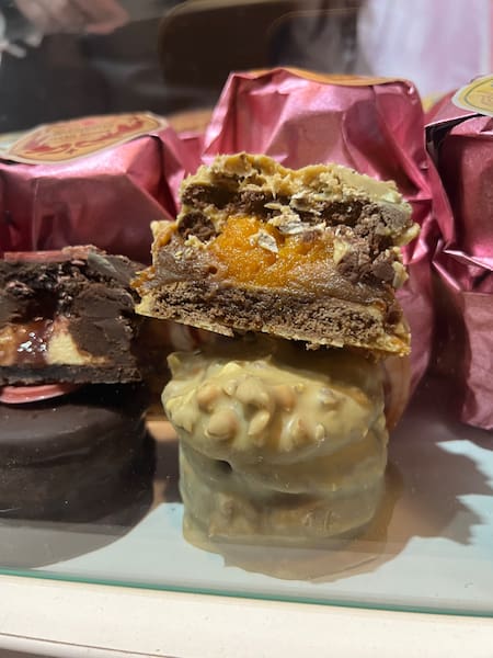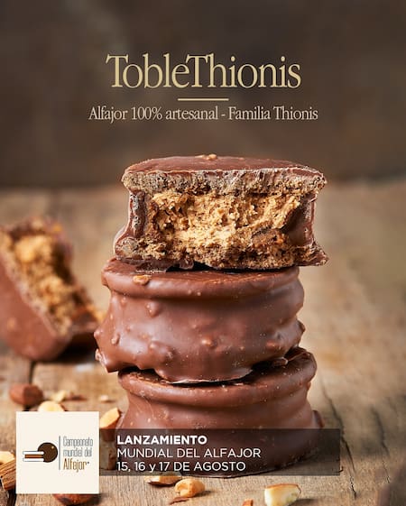 El alfajor Thionis destaca por su relleno de Toblerone y almendras, que une el chocolate suizo con el crocante irresistible de las almendras. Con un valor de $4.000, es una opción ideal para quienes no se empalagan nunca y buscan un alfajor lleno de sabor.