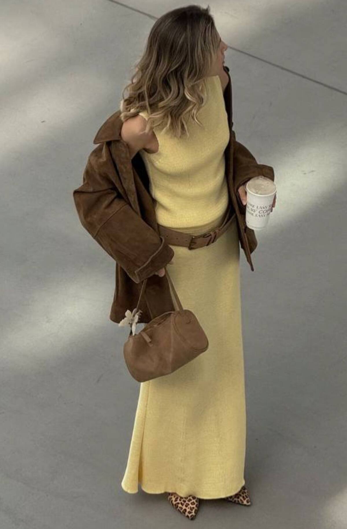 - Vestido camisero o slip dress yellow: perfecto para días cálidos. Se puede usar solo o con una camiseta blanca debajo para un toque casual. Para un poco más de textura, agregá una chaqueta de mezclilla o blazer neutro para transicionar a la noche.