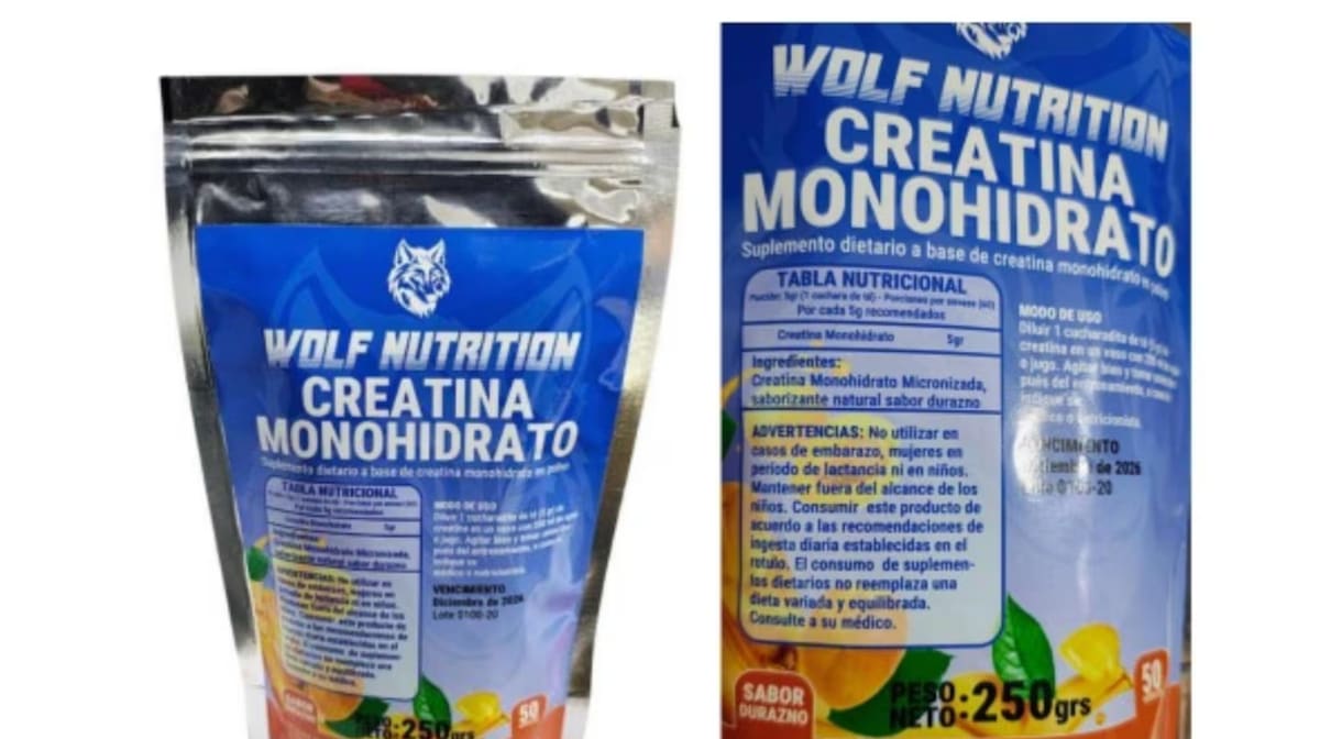 La Administración Nacional de Medicamentos Alimentos y Tecnología Médica (ANMAT) prohibió la elaboración, fraccionamiento y comercialización del suplemento dietario de creatina monohidrato sabor durazno de la marca Wolf Nutrition, luego de constatar que los números de Registro Nacional de Establecimiento (RNE) y de Registro Nacional de Producto Alimenticio (RNPA) que figuraban en el envase son inexistentes.