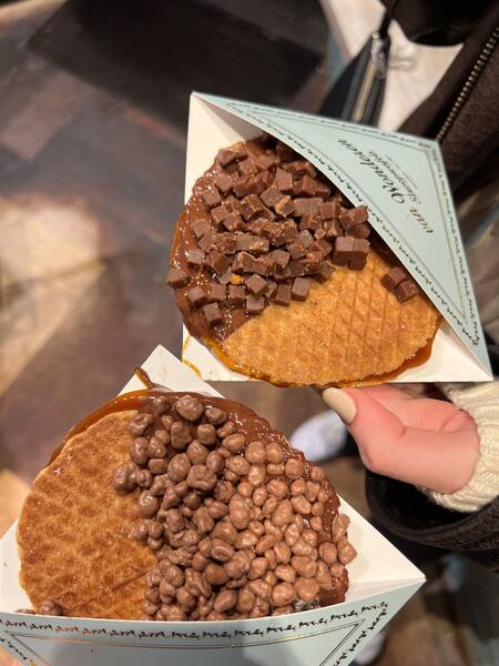 Dos finas galletas tipo waffle unidas por un relleno de caramelo espeso. Se suelen calentar sobre la taza de café para ablandar el centro.