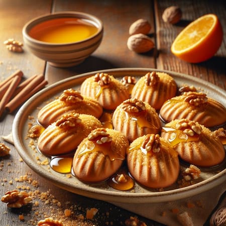 Galletitas navideñas típicas, blandas y aromáticas, hechas con sémola, aceite de oliva, naranja, especias y bañadas en almíbar de miel. Se espolvorean con nueces y tienen una textura jugosa.
