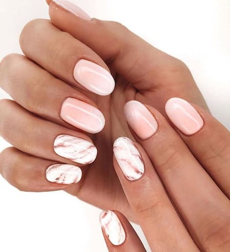 Las tonalidades suaves como lavanda, menta y durazno se fusionan en patrones marmoleados, creando un look delicado y sofisticado. Este diseño es perfecto para quienes buscan una manicura elegante y fresca.