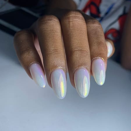 Aplicando polvos holográficos sobre una base neutra, se logra un acabado que cambia de color según la luz, brindando un aspecto moderno y llamativo sin ser excesivo.
