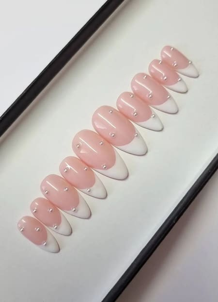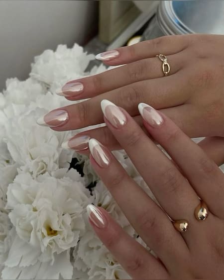 Una reinterpretación moderna de la clásica manicura francesa, incorporando puntas cromadas en tonos metálicos como oro rosado o plata, aportando un toque de glamour y originalidad.