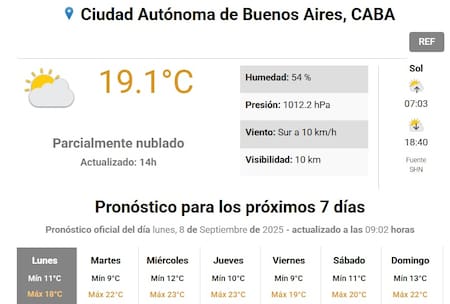 - Viernes 12 de septiembre: mínima de 9°C y máxima de 19°C, cielo parcialmente nublado.