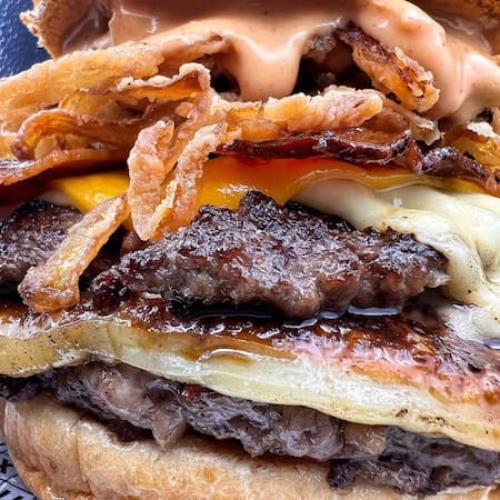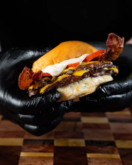 A esto se suman un queso cremoso que se funde suavemente, tocino crocante y salado, y salsas que equilibran acidez, especias y untuosidad. Todo queda envuelto en un pan brioche tierno y esponjoso, que absorbe los jugos sin perder estructura.