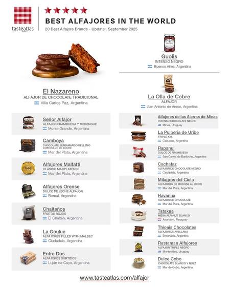 El primer puesto fue para El Nazareno, una marca artesanal originaria de Villa Carlos Paz, provincia de Carlos Paz. Desde Taste Atlas destacaron la dedicación con la que esta pequeña empresa mantiene viva la tradición del alfajor.