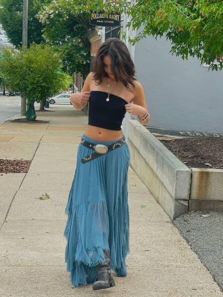 La protagonista de este look es una falda larga boho, con estampados florales o étnicos en tonos tierra, mostaza o vino. Se combina con una remera básica blanca o un crop top neutro, ajustado al cuerpo para equilibrar el volumen de la falda.