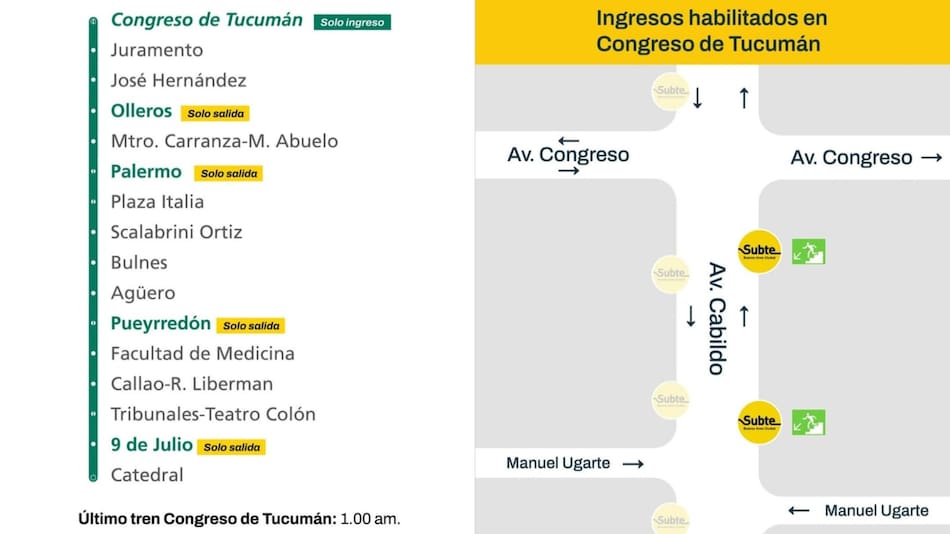 De acuerdo con la información oficial, la estación habilitada para el ascenso de pasajeros será Congreso de Tucumán, mientras que los descensos podrán realizarse en Olleros, Palermo, Pueyrredón y 9 de Julio. El esquema busca ordenar el flujo de personas tras los shows y garantizar un regreso seguro.