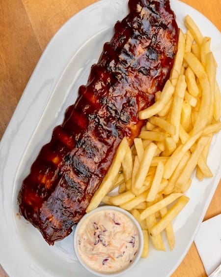 Los platos del menú varían entre caesar’s salad, caesar’s chicken salad con pollo, ensalada mediterránea, pechuga de pollo grillada a la leña con papas rústicas, coleslaw y BBQ rock o crepes rellenos de espinaca y queso, macaroni & cheese (pasta con queso cheddar, trocitos de pollo grilllado y parmesano) o small red hot quesadillas (tortilla de trigocrujiente rellena de lomo) o pollo con queso muzzarella y salsa pisco acompañada por un mix de hojas o unas papas bastón.