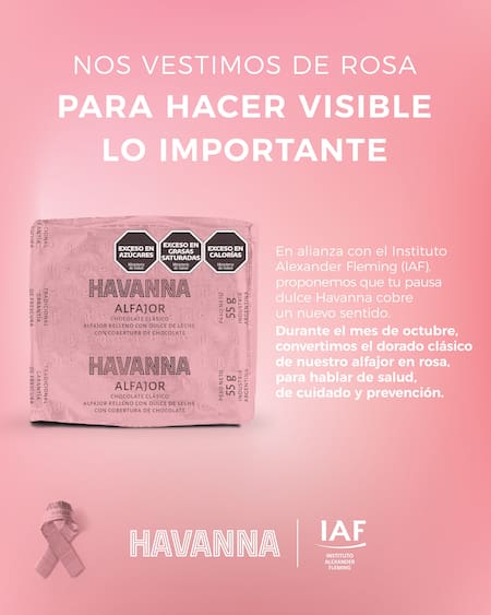 Durante octubre, Havanna se viste de rosa por un motivo especial. Es para concientizar sobre la prevención del cáncer de mama. En una alianza con el Instituto Alexander Fleming (IAF), la reconocida marca de alfajores lanzó una edición especial con envoltorio rosado.