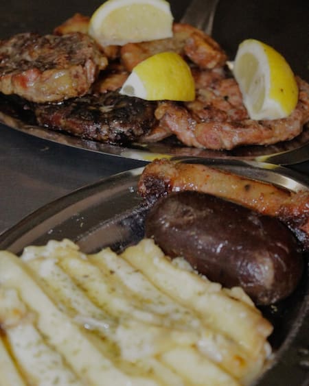 Luego siguen las achuras (chorizo relleno con morrón, morcilla, chinchulín de ternera, riñón con provenzal, mollejas), y también provoleta y provoleta completa. También se suman las delicias de la parrilla: asado ancho y vacío, lechón, cordero entrerriano, costillitas de cerdo, pechito y bondiola, pollo al limón, asado fino y entrerriano, bife de chorizo, matambrito tiernizado y entraña.
